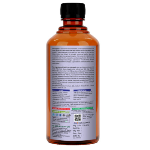 AE Naturals Dia Care Herbal Juice is a scientifically formulated Ayurvedic solution designed to support healthy blood sugar levels and promote overall metabolic wellness. This powerful 500ml juice combines time-tested natural herbs traditionally used in diabetes management.