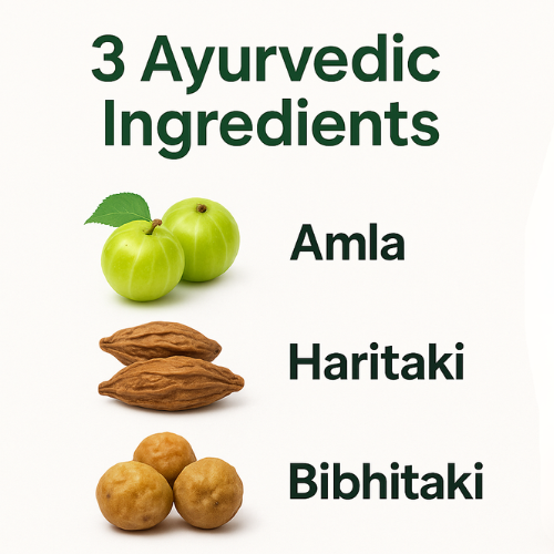 - Natural blend of Amla, Haritaki, and Bibhitaki