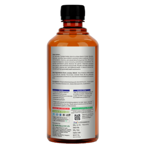 How to Use: Take 30ml of AE Naturals Triphala Herbal Juice mixed with equal amount of water, twice daily on an empty stomach or as directed by a healthcare professional.